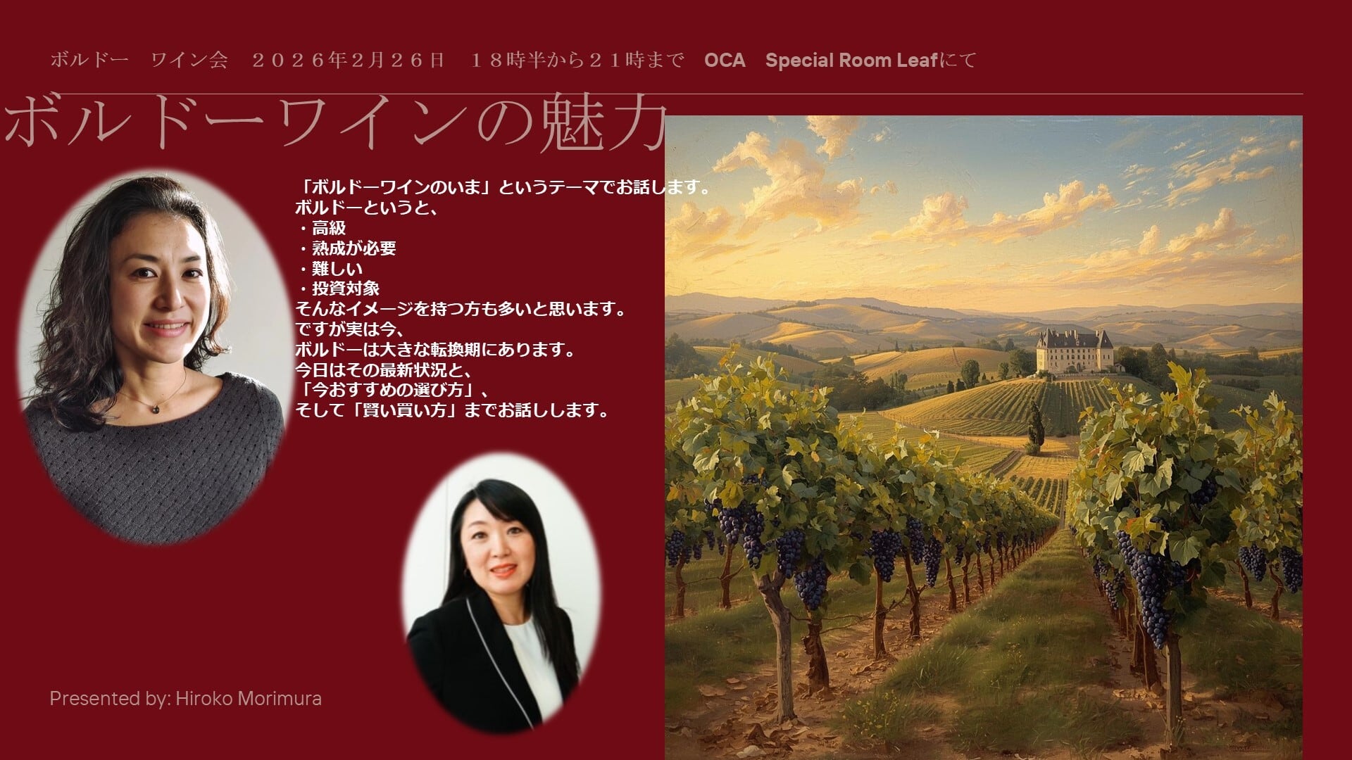 2月26日にボルドー在住、Arome ConsultingのHugel Kaoruさんをお迎えして、題して「ボルドーワインの今」と題したワイン会を開催します!伝統あるボルドーワインの歴史のおさらいと、現在の最新Trendについて、トークを交えてのセッションを、おいしい食事と美味しいボルドーワインとともに、お楽しみいただけましたら幸いです!シャンパーニュ、そして、白、赤の特別なボルドーワインを数種類用意しております!